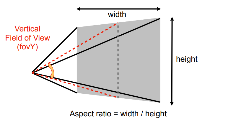 我們可以給螢幕定義一個寬高比,這被稱為 aspect ration,值為寬度除以高度。 另外還有一個概念,如果有玩過相機的可能會知道,叫做視角,英文叫 field of view,表示可以看到的角度範圍