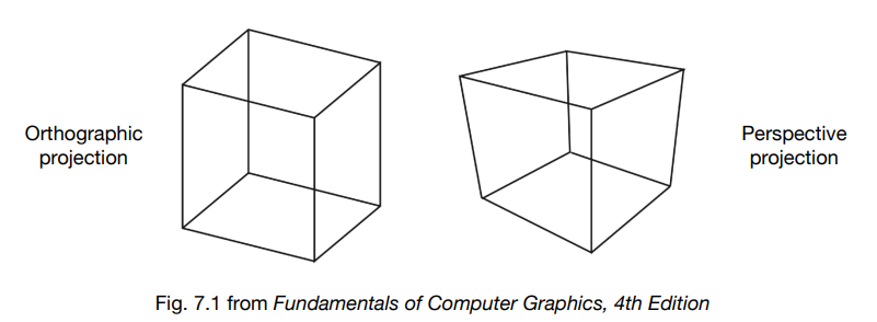 如果你學習過素描,或是畫畫,就會知道說右邊的這種投影方式更接近人眼的成像,它會有一個性質:看到的平行線不再平行,最終都會相交到某一個點去,也因此其可以反映近大遠小的特性
