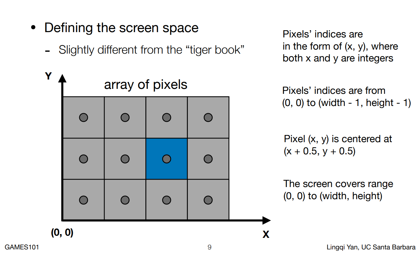 換句話說螢幕可以被表示成一個坐標系,這個坐標系我們通常稱其為螢幕空間(screen space),虎書內有自己的一套坐標定義方式,而這邊(GAMES101) 我們有另一套定義方式: