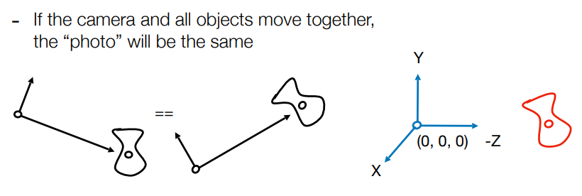 這個現象可以幫助我們得出一個結果,要達到相機看起來在移動的效果,我們是可以透過改成移動周圍的物體來達到相同目的的,只要保證他們之間沒有相對運動就行,這樣我們就可以讓相機固定在同一位置上了