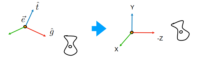 接下來要找一個好的位置,橋一個好的角度來放相機,這個我們稱為 view transformation。 這會將物體從世界空間轉換到相機空間(camera space),也有人稱之為視圖空間(view space),是以相機為原點的座標系