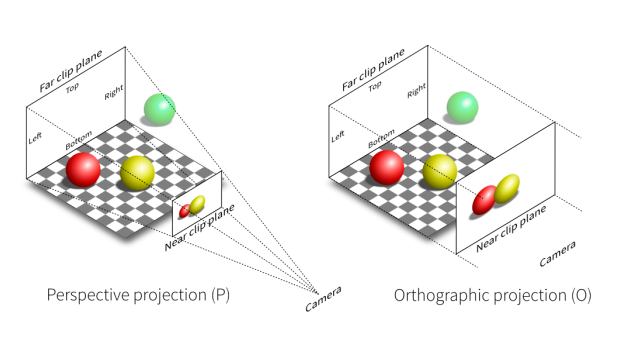 而對於正交投影,其實就是假設相機離的無限遠。 以我們上面透視投影的例子來說,將相機拿得越來越遠,近平面與遠平面看起來就會越來越接近,當我們把相機拿到無限遠時,就會發現近平面與遠平面變的一樣大了。 因此在投影出來的結果就會看到,無論物體有多遠,投影到近平面上是不會有近大遠小的效果的