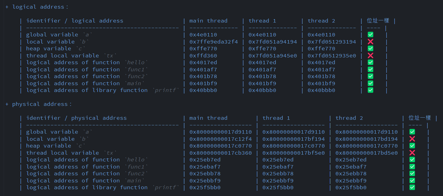 identifier / physical address main thread thread 1 thread 2 位址一樣 global variable a0x80000000017d9110 0x80000000017d9110 0x80000000017d9110 ✅ local variable b0x80000000017c12f4 0x80000000017bf194 0x80000000017bd194 ❌ heap variable c0x80000000017c0770 0x80000000017c0770 0x80000000017c0770 ✅ thread local variable tx0x80000000017cb360 0x80000000017bf5e0 0x80000000017bd5e0 ❌ logical address of function hello0x25eb7ed 0x25eb7ed 0x25eb7ed ✅ logical address of function func10x25ebaf7 0x25ebaf7 0x25ebaf7 ✅ logical address of function func20x25ebb78 0x25ebb78 0x25ebb78 ✅ logical address of function main0x25ebbf9 0x25ebbf9 0x25ebbf9 ✅ logical address of library function printf0x25f5bb0 0x25f5bb0 0x25f5bb0 ✅