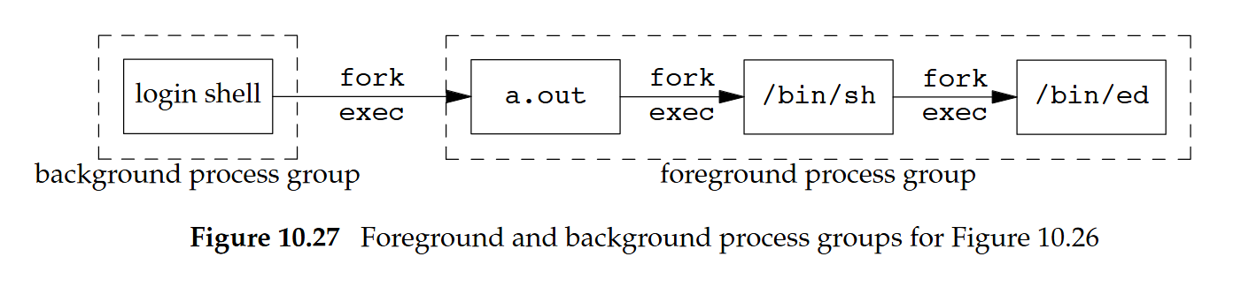 init會將三個工作控制相關信號(SIGTSTP、SIGTTIN與SIGTTOU)的 disposition 設為SIG_IGN,而這個 disposition 會被所有登入 shell 繼承。 之後支援工作控制的 shell 會再把這三個信號的 disposition 重設為SIG_DFL當我們輸入 suspend 字元時,行程會收到