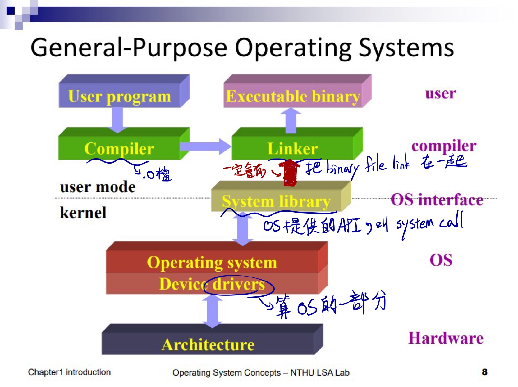 Device Driver 也算 OS 的一部份,把它抽出來是因為它是可以一直更新、抽換的;Driver 上面就會有 OS 的主要部分,也就是如何管理 memory、cpu 等等的軟體,這個軟體會提供一些 API,也就是前面提到的 System call,OS 會把它包起來成 System library,讓我們使用
