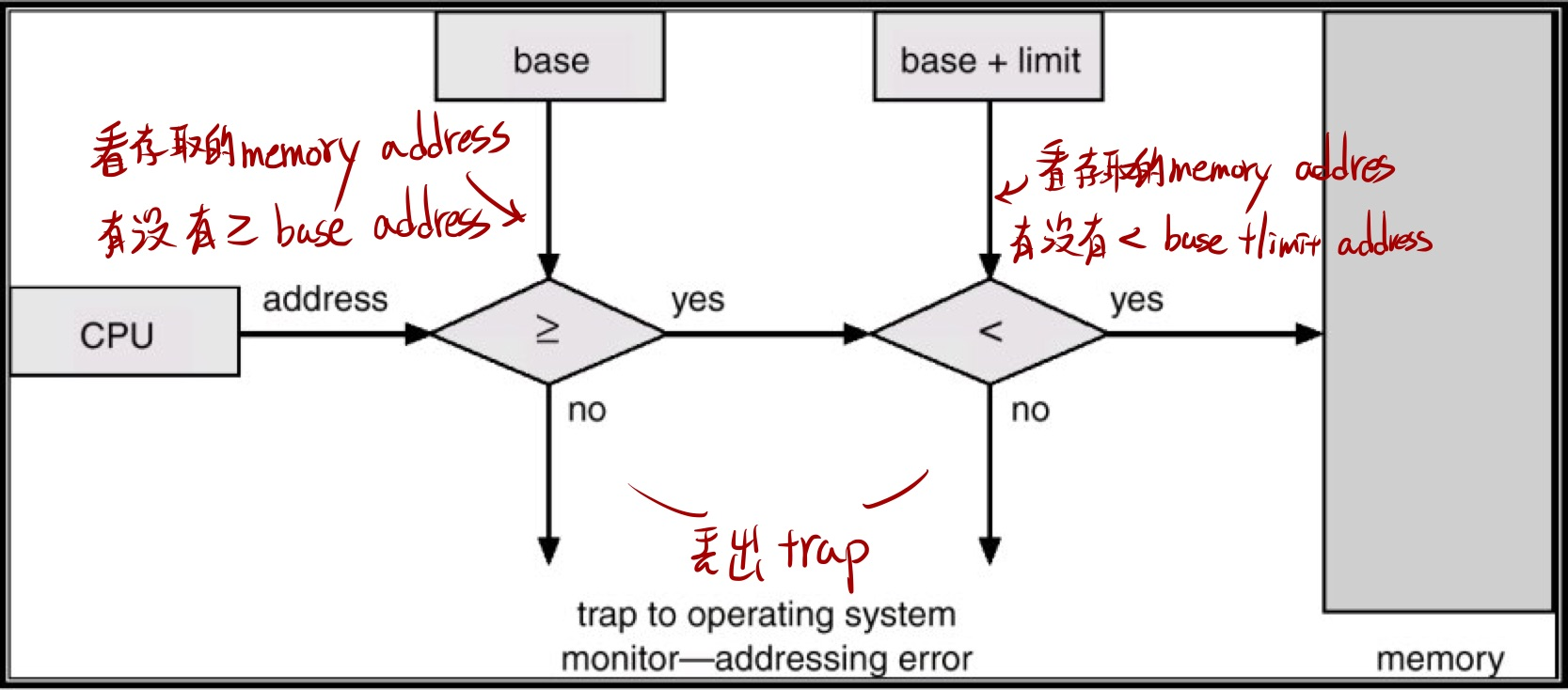 先去檢查存取的 address 有沒有大於 base address,再去看有沒有小於 base address + limit,都通過慈可以存取 memory