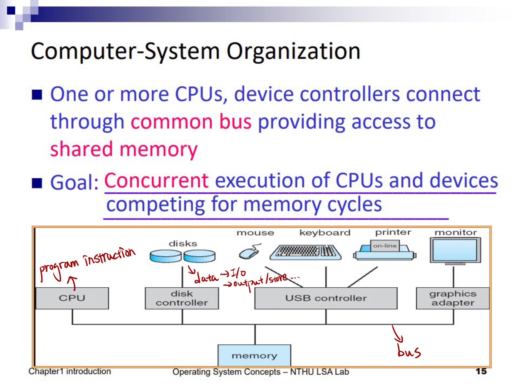 電腦系統有很多不同的 Hardware,我們需要把它串起來,你把主機打開來可以看見它有 bus、線,而作業系統的目的就是要控制、協調這些硬體的使用,可以看看下面這張圖: