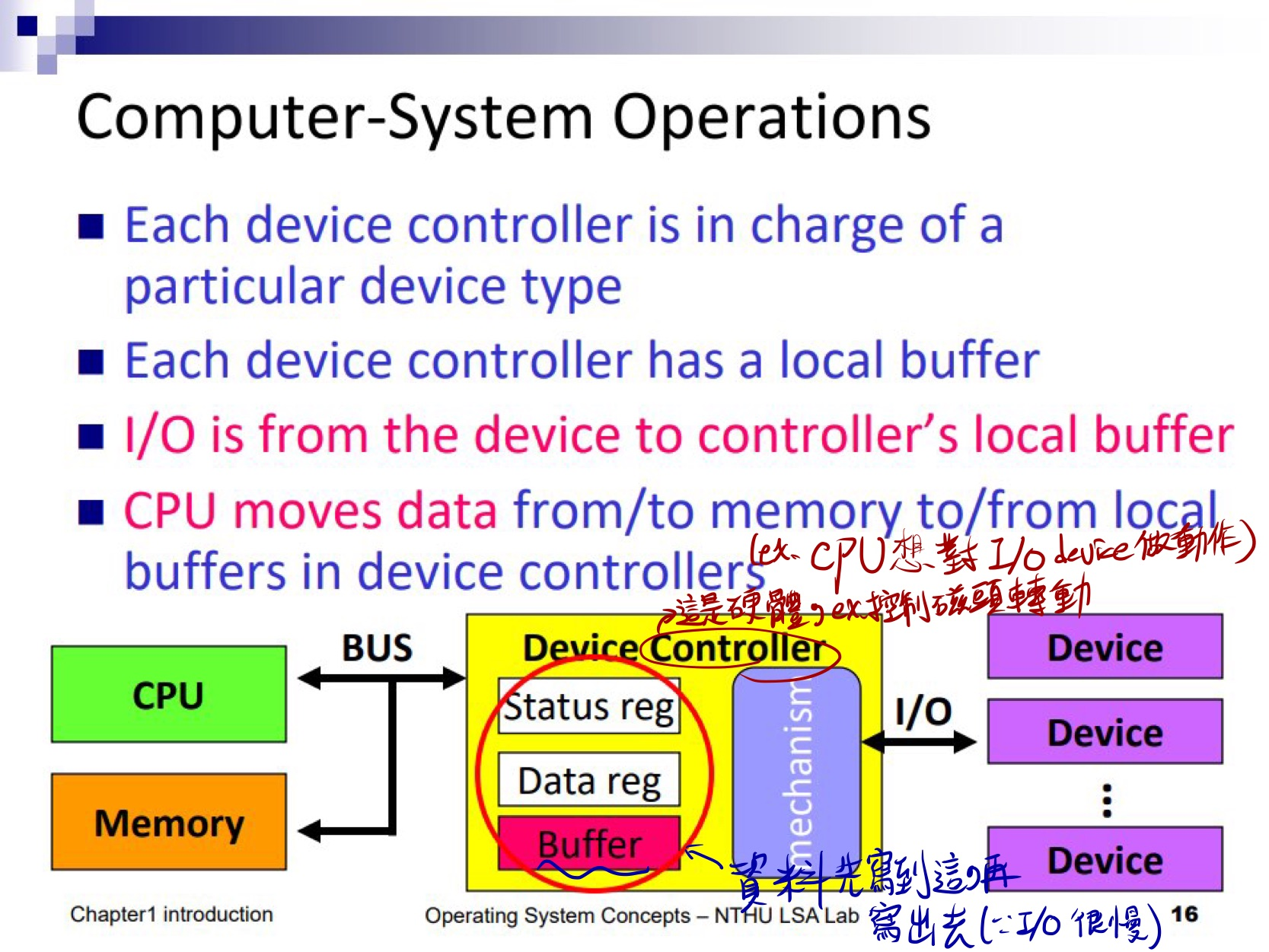 而為了要透過 buffer 去讀寫,Device Controller 就會需要有 Status Register 和 Data Register 來控制 Device Controller。 Status Register 會告訴它現在是 busy 還是 idle;Data Register 則可以想像成另一個 buffer,我們先很快寫到 Register 上,再寫到 buffer