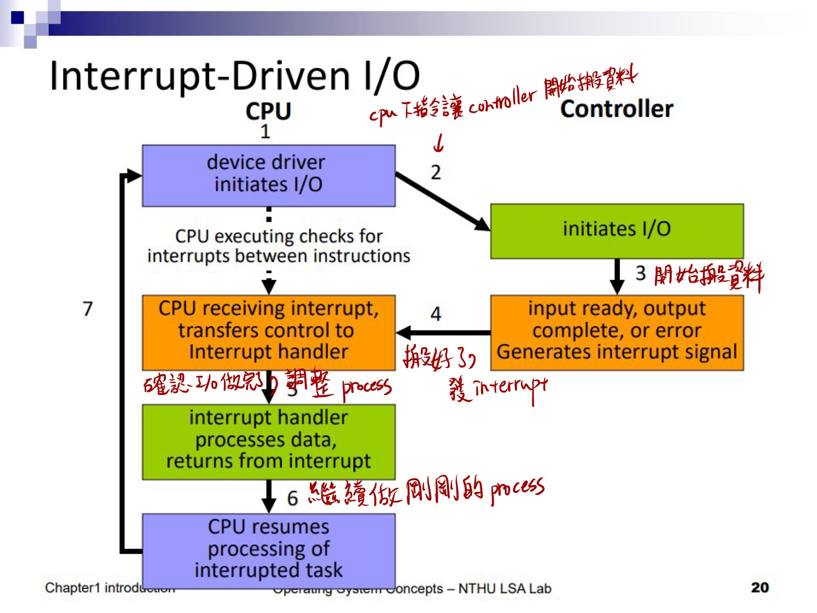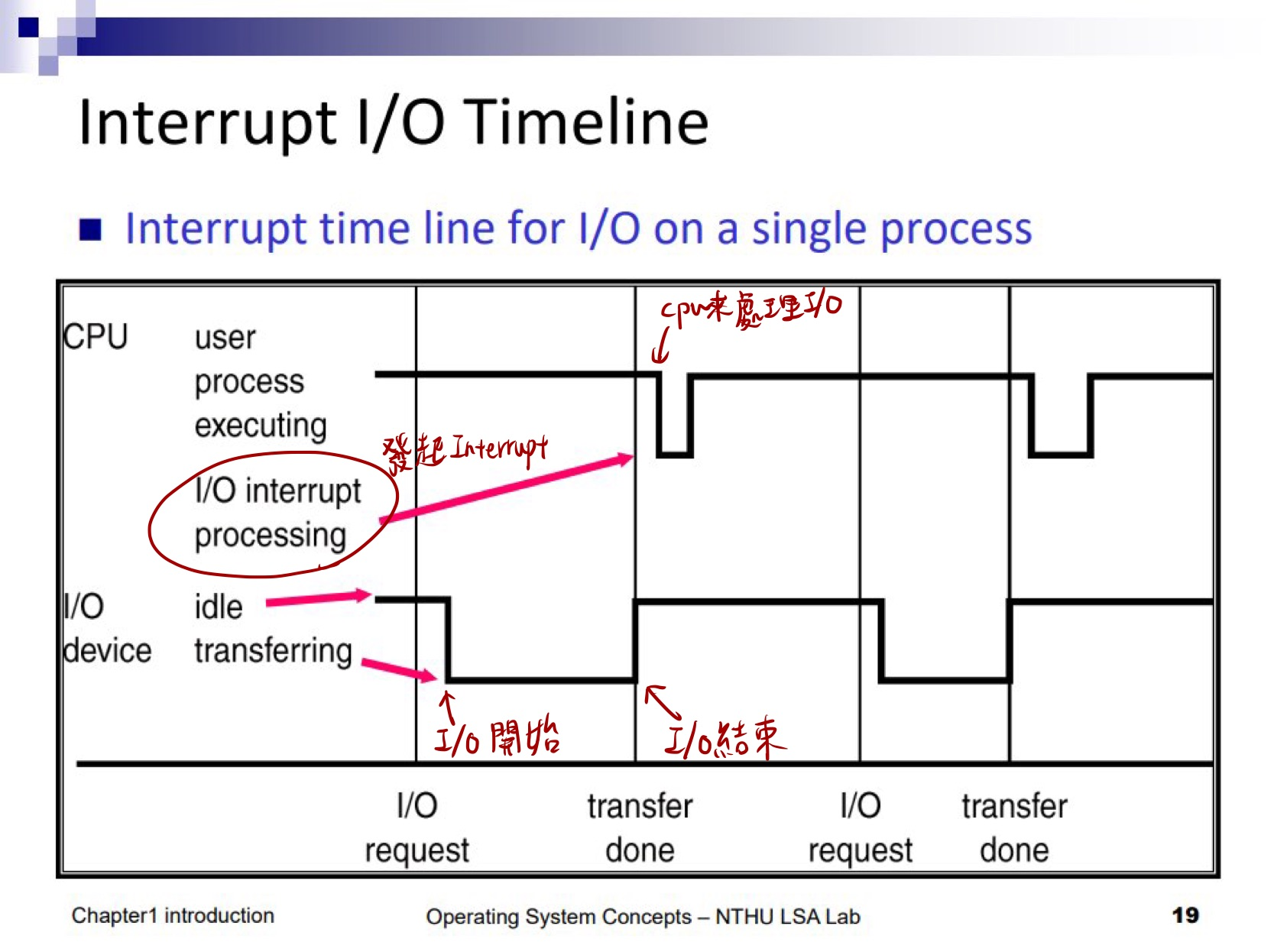 所以回到圖裡,cpu 接到 Interrupt 後,會有一個 interrupt handler 先去確認剛剛 I/O 的動作已經做完了,然後看要把原本的程式啟動起來,或是把它的狀態改成可執行之類的