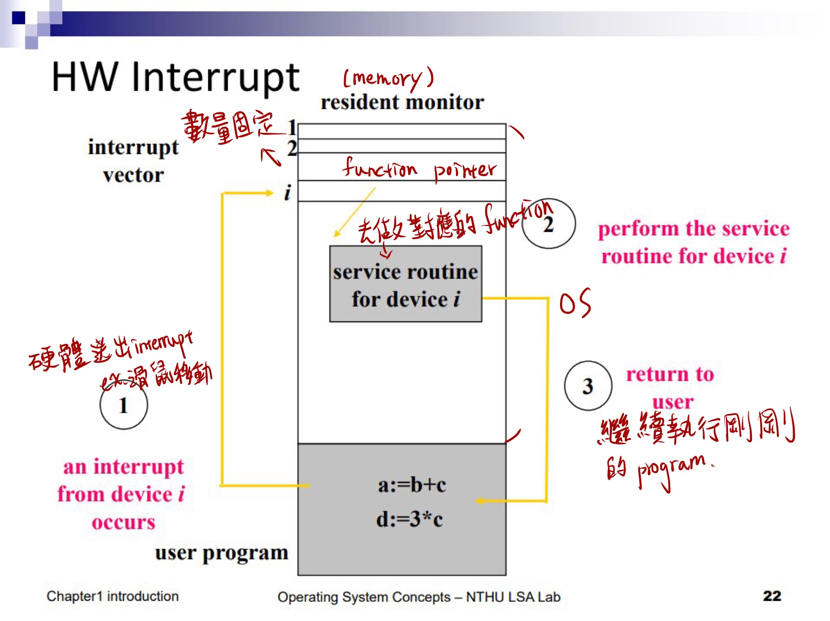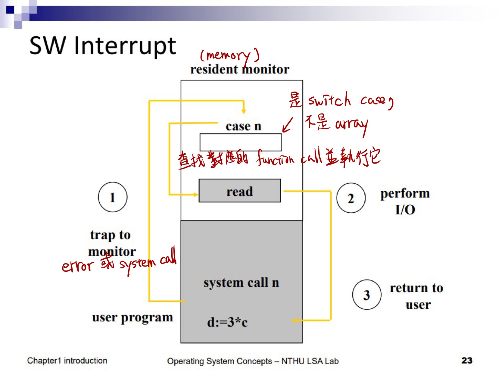 但總之一樣會有個 number,讓它可以去查是對應哪個 function call,並去執行那個 routine,然後再回到剛剛被打斷的 Process