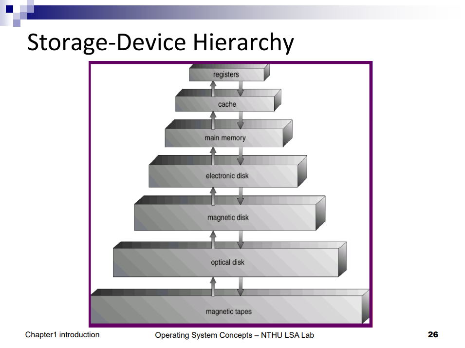 上面三個分別為暫存器、快取、主記憶體,而後面的則統稱為次級儲存裝置 (Secondary Storage)。 越上層的速度越快,容量越小,反之越下層的速度越慢,但容量越大,價格也比較便宜
