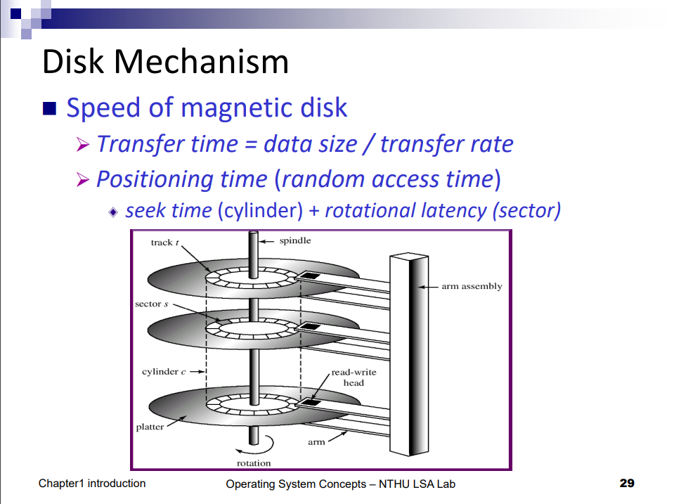 這邊看一下 Disk,他不是電子式而是機械式的,它會有讀寫的手臂,手臂上面有很多磁頭可以同時讀寫多個磁盤,磁盤有很多個,可以旋轉: